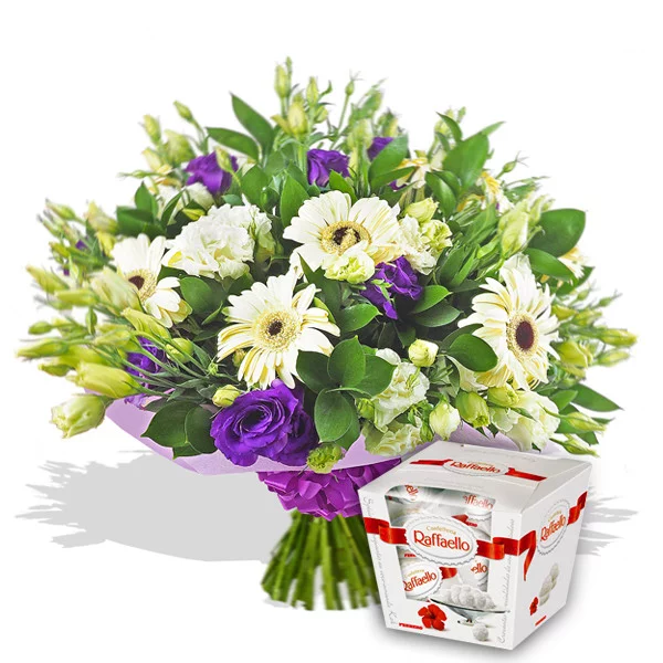 Стандартный (на фото): гербера белая - 7 шт., эустома белая - 4 шт., эустома фиолетовая - 4 шт., рускус, фетр фиолетовый, бант фиолетовый. + конфеты "Raffaello" 150 г. - 1 шт.