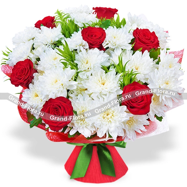 Стандартный: роза красная - 7 шт., хризантема белая - 8 шт., декоративная зелень, упаковка, лента.