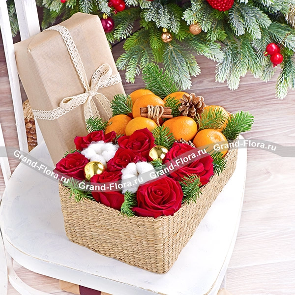 Стандартный: роза красная - 7 шт., хлопок - 2 шт., шарики - 2 шт., ель, мандарины - 1 кг., шишка - 1 шт., корица - 1 шт., оазис, корзина.